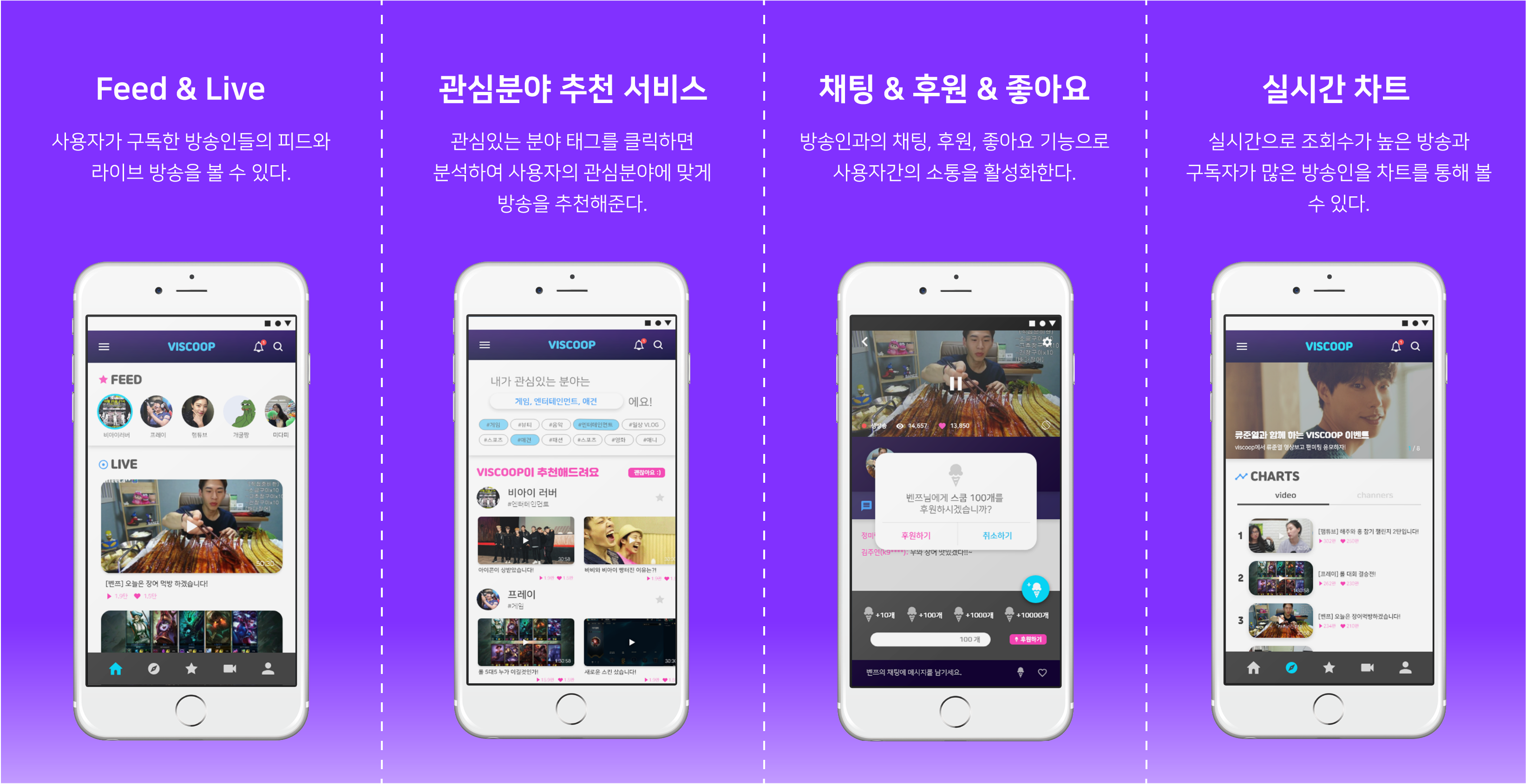 기존 VISCOOP이라는 앱은 라이브 방송 앱으로 인터페이스의 직관성, 편의성이 부족하여 리디자인을 하여 사용자들의 타겟층을 넓히고 사용자들이 이용하는데 불편함을 느끼지 않고자 하는 것이 목표입니다. 리디자인 어플의 정의는 사용하기 쉽고 다양한 콘텐츠들이 모여있는 모바일 생방송 어플리케이션입니다.